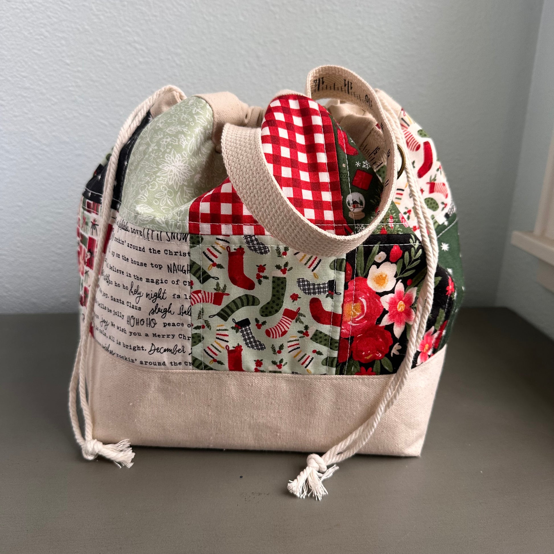 One-of-a-kind project bag using high quality quilting cottons or flannels, and sturdy canvas. Always making use of scraps of fabric. Each bag is pieced and machine quilted. Each bag I make is unique..